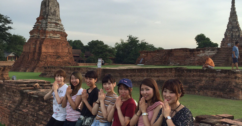 Shino and other Hijiyama students enjoying some of the beautiful ancient ruins in Ayutthaya with Thai students ! Ayutthaya is a UNESCO town full of old and historical sights !